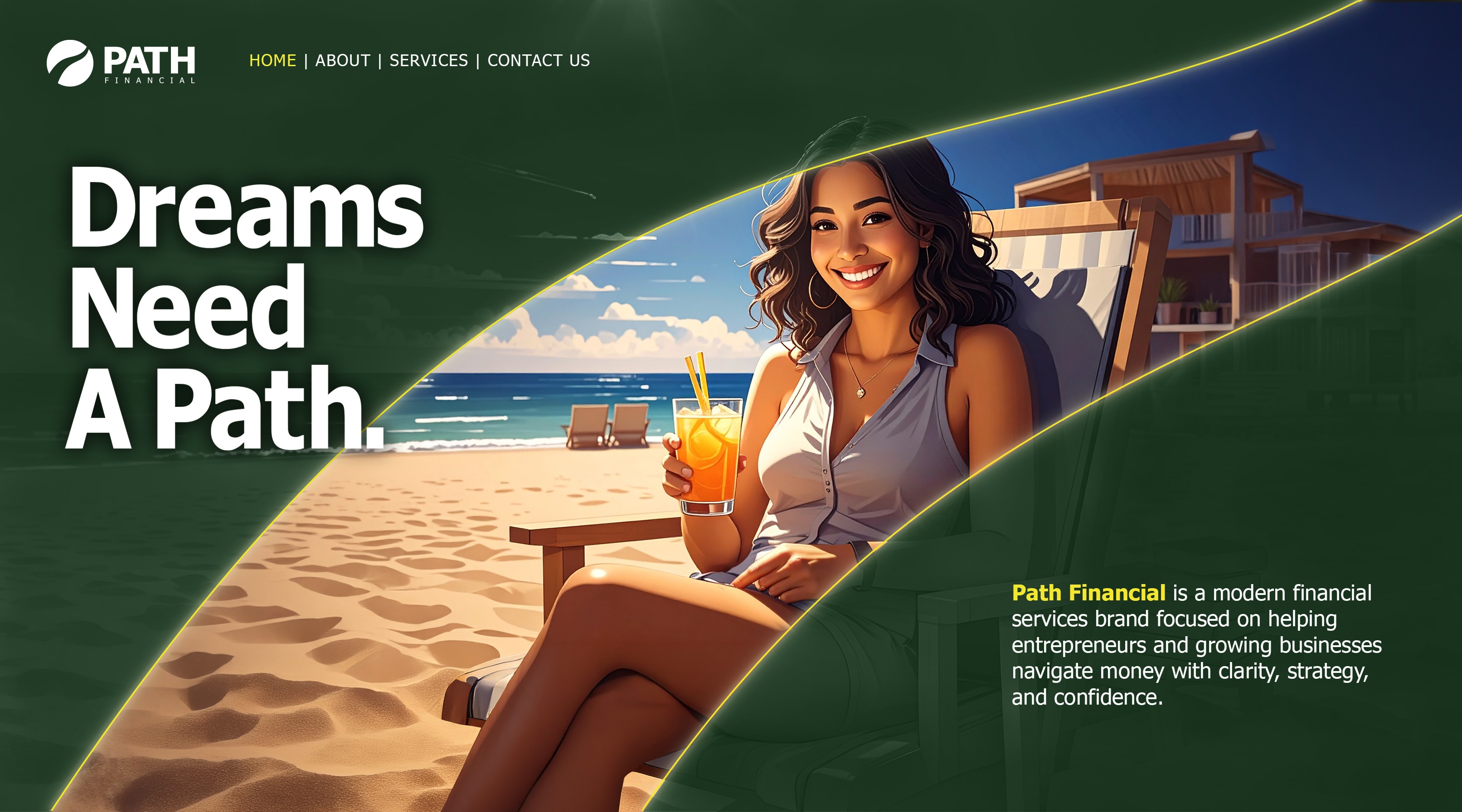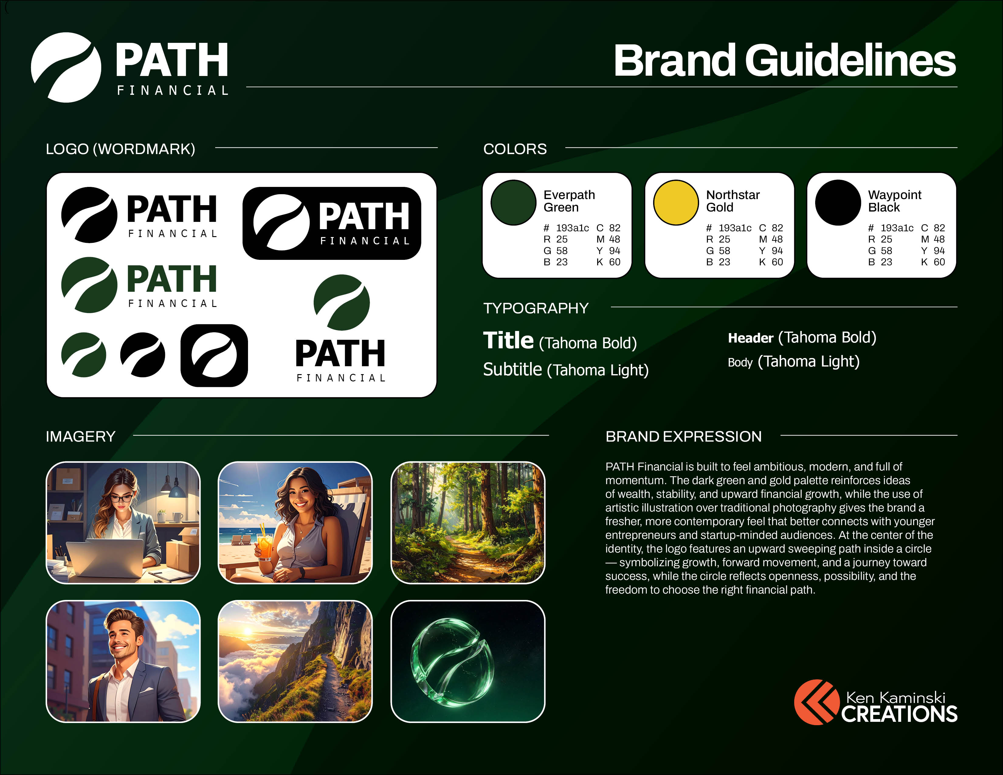 The result was a polished brand identity that positioned Path Financial as a more modern and aspirational presence within the financial services space. Through the use of a dark green and gold color palette, an upward-moving path-based logo, and artistic illustration in place of traditional photography, the final design system successfully conveyed growth, opportunity, and sophistication while feeling more approachable to a younger audience of entrepreneurs and startups. The brand ultimately achieved a balance between trust and energy, helping Path stand apart from more conventional financial competitors with a visual identity that feels both strategic and forward-looking.